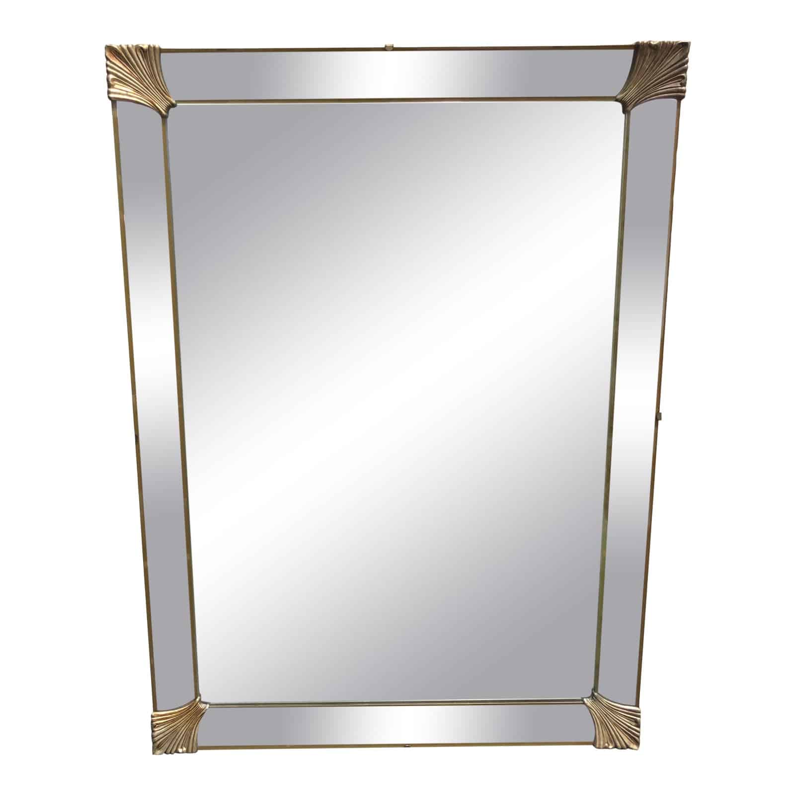 This stunning Art Deco wall mirror is a genuine 1920s antique mirror. Found in a Palm Beach Mansion, this gorgeous mirror is mirrored on the frame and the center with beautiful metal Art Deco style fan details on each corner.