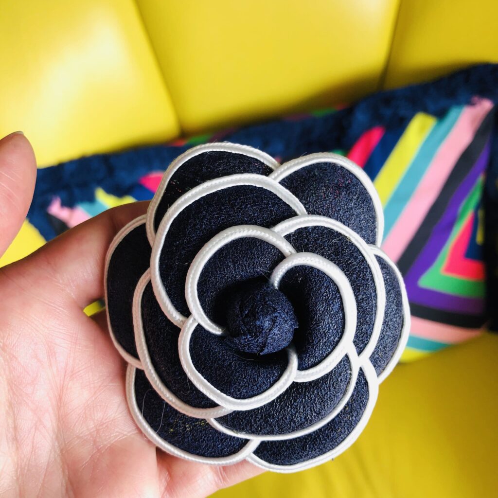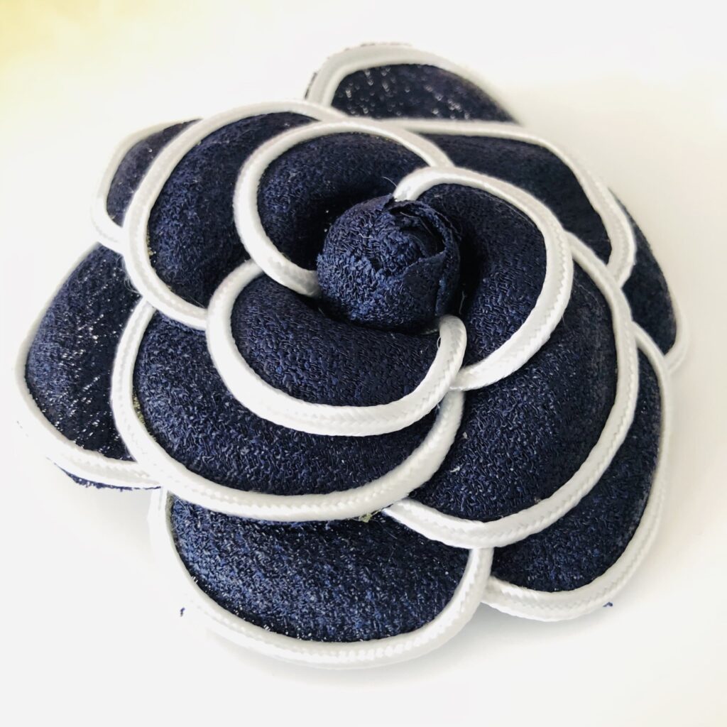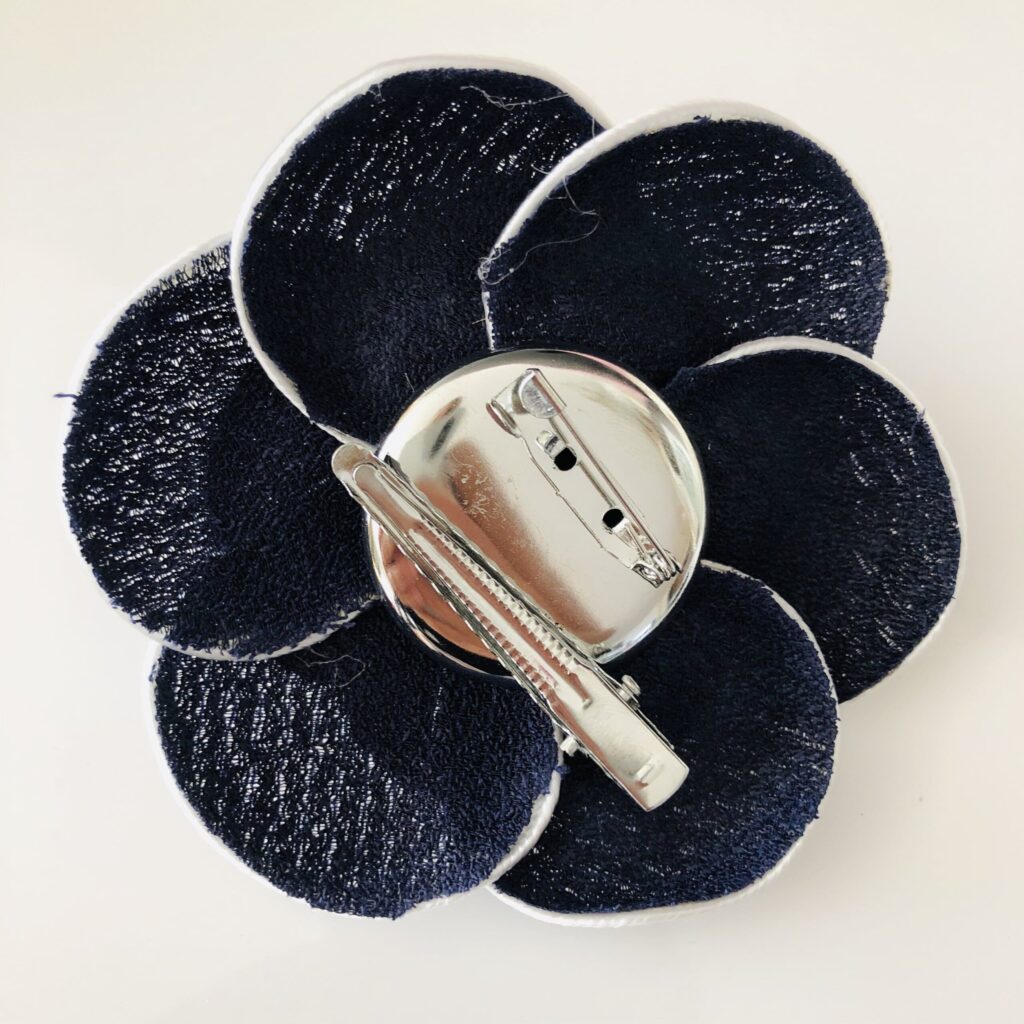 Inspired famous Coco Chanel fashion, this beautiful camellia brooch is designed to be a brooch and hair clip. In midnight black, the color blends perfectly as black or with navy blue tones. Wear this in your hair, on garments, attach it to handbags, or use it as a luxury addition to home decor items such as frames, pillows, or other accessories.